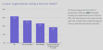 根据 CNCF 2020 年调查,46% 的组织在生产中使用服务网格或计划在未来 12 个月内使用。Istio 是在生产中使用的最多的网格。