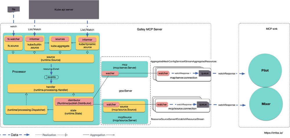 从上图可以看到,Galley 配置服务主要包括 Processor 和 负责 mcp 通信的 grpc Server.