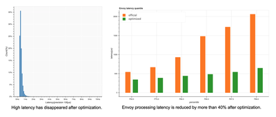 进行架构优化之后,我们也做了对比测试,上图左测是延时与消息数量图,可以看到它高延时部分得到明显的改善。上图右可以看出 Envoy 整体的延时降低了 40% 以上。
