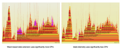 使用火焰图重新观察一下 Envoy 内部的 CPU 使用分布,我们发现 tstats 遥测插件占用 CPU 的比例明显更少,而使用 wasm 的遥测插件有一个明显的 CPU 占用来实现遥测,这也证明了 tstats 优化是有效果的。