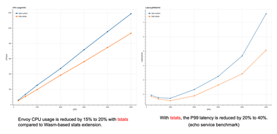 经过优化之后,对比 tstats 遥测和官方的基于 Wasm 的遥测的性能,我们发现 CPU 降低了 10 到 20%,相对于老版本的 mixer 来说降低了 20% 以上,符合了我们对 envoy 性能调研的一个预期。上图右可以看到在延时上有一个明显的降低,即使在 P99 在不同的 QPS 下,也会有 20% 到 40% 的总体降低 (这个延时是使用 echo service 做 End-to-End 压测得到的)。