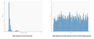 经过离线分析,我们发现了 Envoy 内消息处理延时的一些分布特征。左图是对 Envoy 处理延时与消息数量分布图,横轴是延时,纵轴是消息数量。可以看到在高延时部份,消息数量有异常增加的现象,这不是典型的幂率分布。进一步对高延时部份进行分析后发现,这些高延时消息均匀地分布于整个测试期间(如上图右所示)。根据我们的经验,这通常是 Envoy 内部转发消息的 worker 在周期性的执行一些消耗 CPU 的任务,导致有一部分消息没办法及时转发而引起的。