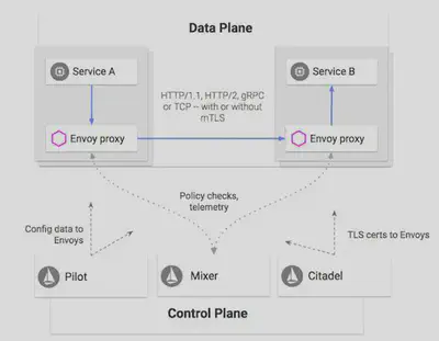 - Istio Service Mesh 由两部分组成。1. 由 Envoy 代理组成的数据面板,它能够拦截网络请求,并控制服务之间的通信。2. 支持服务的运行时管理的控制面板,它提供策略实施、遥测数据收集以及证书轮换等功能。
