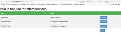 nodeAppTesting(etcd-service) ->{"action":"get","node":{"key":"/istioTest","value":"Testing Istio using NodePort","modifiedIndex":15,"createdIndex":15}}