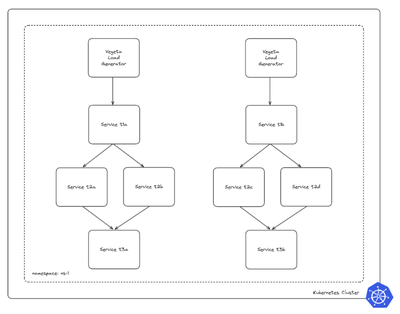 为了生成合成负载,我们使用 Vegeta,每个应用有一个实例(每个命名空间两个)。还有四个节点用于负载生成器,向每个第 1 层副本每秒发送 200 个请求。这些请求在显示的边缘生成后续请求到第 2 层和第 3 层,给每个租户带来 2000 RPS 的负载,整个集群总共 50000 RPS。我们确保我们在测试中看到的延迟结果符合我们定义的预期,没有请求在 p50 超过 10ms 或在 p95 超过 15ms。