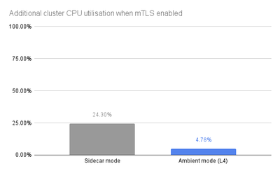 而且,CPU 利用率极低:仅增加 4.78% 的 CPU 以在我们的工作负载中添加 mTLS,而添加 sidecar 相比增加了 24.3%。假设你的集群中的所有节点都至少有 5% 的空闲开销,你可以在不增加任何额外节点的情况下安装 Istio 的环境模式,从而使其实际上免费运行。