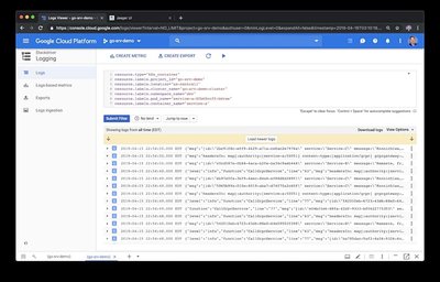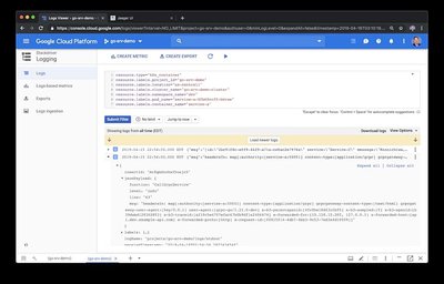 如果您还记得,Banzai formatter会自动将运行时/堆栈信息(包括函数名和行号)标记在日志消息里;在排查故障时非常有用。我们还使用Logrus的JSON formatter。在下面显示的 Stackdriver 控制台中,注意下面的每个日志条目如何在消息中包含 JSON 有效负载,包含日志级别、函数名、日志条目的起始行和消息。