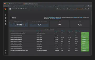 尽管将 HTTP JSON 转换为基于 gRPC 的 protocol buffers 需要对服务进行大量的代码更改,但这并不影响我们使用 Istio 提供的工具 (包括 Prometheus、Grafana、Jaeger 和 Kiali) 对服务进行观测。