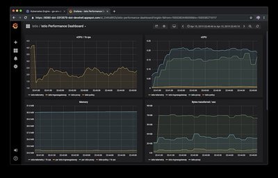 Istio的 Grafana 插件是 Grafana 的一个预配置的实例。Grafana Docker 基础镜像已经修改为带有 Prometheus 数据源和安装好的 Istio 仪表板。下图展示了看到的两个预先配置的仪表板:Istio Mesh 仪表板和 Istio 性能仪表板。