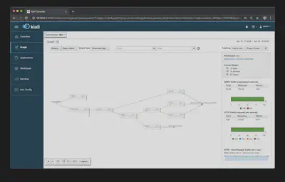 Kiali UI 中的图形视图是运行在 Istio 服务网格中的组件的可视化表示。下图显示了过滤集群的 dev 命名空间,可以注意到 Kiali 已经映射了平台中的所有组件,以及丰富的元数据,比如它们的版本和通信协议。