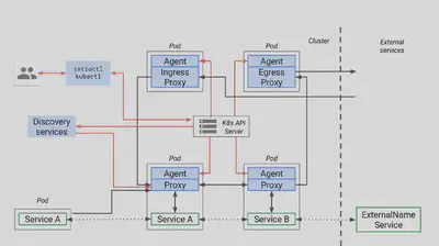 - service A/B:使用了 istio 的应用,如 Service A/B,的进出网络流量会被proxy接管