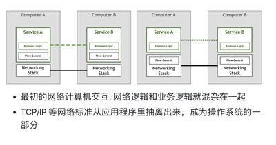 在计算机网络发展的初期,开发人员需要在自己的代码中处理服务器之间的网络连接问题,包括流量控制,缓存队列,数据加密等。在这段时间内底层网络逻辑和业务逻辑是混杂在一起。