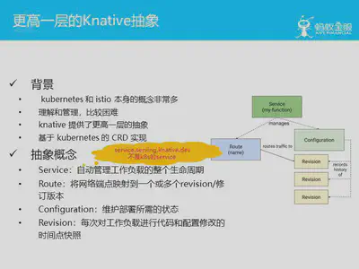 knative 的这些抽象都是基于 kubernetes 的 CRD 来实现,具体抽象概念有:Service、Route、Configuration 和 Revision。特别提醒的是,右边图中的 Service 是 knative 中的 service 概念,service.serving.knative.dev,而不是大家通常最熟悉的 k8s 的 service。