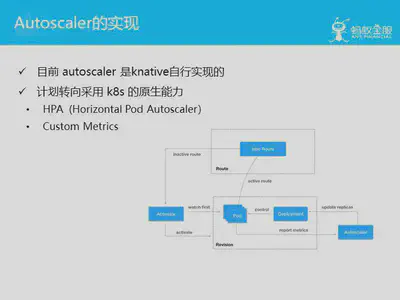 前面讲过 knative 的 Autoscaler 是自行实现的,而 k8s 目前已经有比较健全原生能力:HPA 和 Custom Metrics。目前 knative 已经有计划要转而使用 k8s 的原生能力。这也符合 Cloud Native 的玩法:将基础能力下沉到 k8s 这样的基础设施,上层减负。