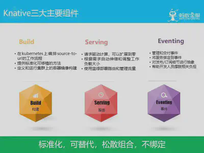 前面提到,google 推出 knative,试图将云原生中三个领域的最佳实践结合起来。反应到 knative 产品中,就是这三大主要组件:Build,Serving,Eventing。