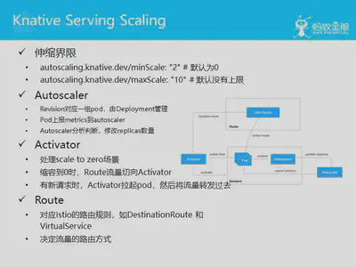 - 当没有流量,需要收缩到 0 时,规则修改为将流量切到 Activator,如果一直没有流量,则什么都不发生。此时 autoscaler 通过 deployment 将 replicas 设置为 0。