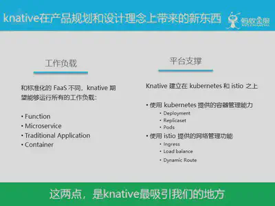 Knative 在产品规划和设计理念上也带来了新的东西,和传统 serverless 不同。工作负载和平台支撑是 knative 最吸引我们的地方。