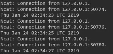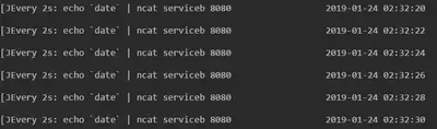该 demo 主要做的事情是:提供两个服务 servicea 以及 serviceb,serviceb 作为服务端,通过 ncat 监听 8080 端口,接受外部的 TCP 消息;servicea 作为 client 端,通过 ncat 将当前 server 的时间发往 serviceb。Demo 的运行效果如下: