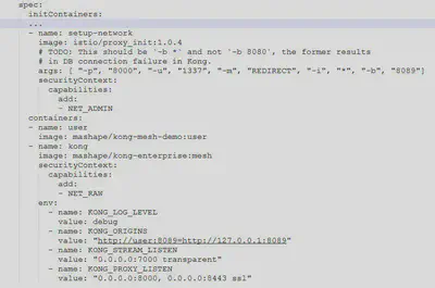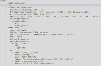部署配置关键点在于流量接管的设置,POD 在启动应用前,会使用 istio/proxy_init 镜像来初始化环境,图中的参数的含义是,使用 TProxy(透明代理)的流量接管模式,将发往 8080 端口(业务 serviceb 监听端口)的流量通过 7000 端口(kong 监听端口)来进行代理。