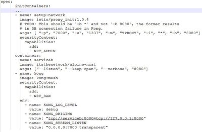 部署配置关键点在于流量接管的设置,POD 在启动应用前,会使用 istio/proxy_init 镜像来初始化环境,图中的参数的含义是,使用 TProxy(透明代理)的流量接管模式,将发往 8080 端口(业务 serviceb 监听端口)的流量通过 7000 端口(kong 监听端口)来进行代理。