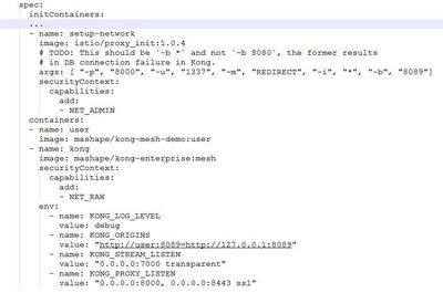 Kong 社区提供了 kong mesh 的 demo (https://github.com/Kong/kong-mesh-dist-kubernetes),该 demo 是实现的是 tcp 四层透明代理转发业务。