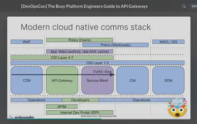 我多次讨论过这一点,包括最近的演讲:“忙碌的平台工程师指南:API 网关” 。在这个栈中,大多数平台构建者将需要三个组件:API 网关(用于南北流量管理)、服务网格(用于东西流量)和容器本地接口或 CNI(用于所有底层软件定义网络)。