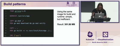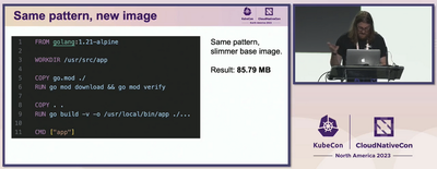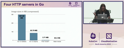 镜像大小的问题对可持续性、存储和网络效率等方面产生了重要影响。这就是为什么我们将首先讨论的话题是 Eric Gregory 的“微型容器的微型讨论”。这个话题对我个人也很有兴趣,我尝试过使用 Docker Slim 来减小镜像大小(包括集成到 CI/CD 流水线中),结果确实令人印象深刻。然而,我们还看到了更进一步的示例,例如使用 WebAssembly,如下图所示。