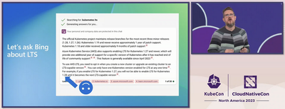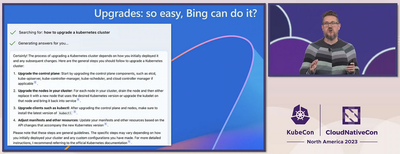 在这个主题中听到有关 AI 的讲解,或者更直接地说是关于 ChatGPT,是相当预料之中的,考虑到微软与 OpenAI 之间的密切联系。我们被展示了“kubectl ai”工具,它允许您根据您的请求轻松生成 YAML,但立即强调 AI 不能做到一切 — 例如,集群升级过程。随后在演示过程中,多次展示了 Bing 回答有关 Kubernetes 的各种问题的能力。