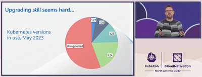 多年来,Kubernetes 的发布频率变得更低,但更稳定 — 是的,现在默认只发布稳定的 API,有关弃用的警告等等。然而,升级过程(通常意味着从一个几乎不再受支持的版本顺序升级到最新版本之一)经常让用户头疼。此外,从 2023 年 5 月的调查数据显示,大多数用户仍在他们的集群中使用已经不再受支持的 Kubernetes 版本,这令人印象深刻。