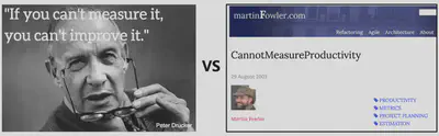 关于这个问题,业界有两派截然不同的观点,一派是以现代管理学之父 Peter Drucker 的理论为依据,主张研发效能能够度量的;另一派是以世界级软件开发大师 Martin Fowler 为代表,主张研发效能不可度量的。