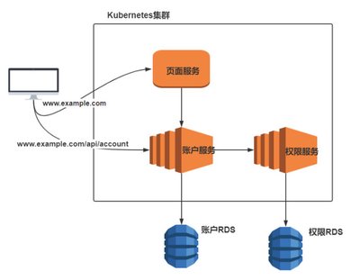 从上面的场景我们可以看到,我们有一个页面服务负责渲染并发页面内容到用户的浏览器,用户会从浏览器访问到页面服务和账户服务。 账户服务负责记录用户名,用户密码等相关信息。账户服务同时还会在权限服务内查看用户是否具有相应的权限,并且页面服务同样也会请求账户服务的某些接口。 所以按照我们上面的流量管理的分类法,页面服务属于第一类服务,权限服务属于第二类服务,账户服务则属于第三类服务。 同时,账户服务和权限服务也接了外部的 RDS 作为存储,需要注意的是 RDS 并非在 Kubernetes 集群内部。