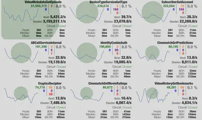 Figure 1. Hystrix dashboard 显示了请求量、各种交互指标和中断状态。圆圈表示请求量,火花线表示过去 2 分钟内的呼叫量的变化。