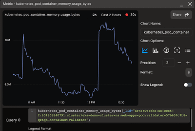 场景可以包括度量指标,允许用户学习 Pod、节点和命名空间之间的关系以及与它们相关的指标。如果所选实体有任何关联的指标,那么它们将出现在上下文菜单中的指标选项卡下。