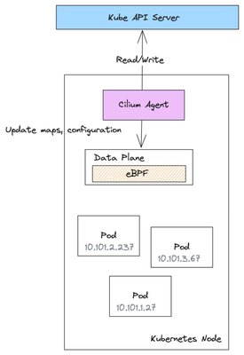 cilium-agent 连接到 Kubernetes API 服务器,监视配置更改,然后使用它来配置数据平面。cilium-agent 还将配置写入 Kubernetes API,表示正在其各自节点上创建的端点或标识。
