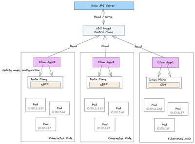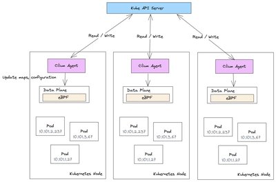 Cilium 控制平面以 cilium-agent 守护程序的形式实现,部署在每个 Kubernetes 节点上。每个 cilium-agent 都是控制平面的单独、独立的实例。