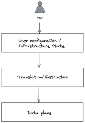 另一方面,用户需要能够以最适合他们用户体验的形式指定配置和策略。很多时候,通过某种 特定领域的配置格式 来实现。然后需要将这种更高级别的用户配置与基础设施状态相结合,并将其转化为较低级别的数据平面格式。转译是一半的战斗。还需要将较低级别的配置分发到数据平面,并高效地执行。这就是控制平面出现在画面中的地方。
