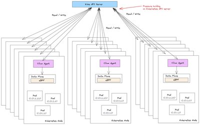 随着集群在节点、Pod、命名空间和网络策略方面的规模增长,每个 cilium-agent 需要执行的工作量也会增加。为了服务和更新所有这些状态,会对 Kubernetes apiserver 造成压力,可能导致 问题。