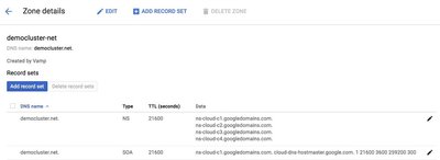 我们在name.com注册了域名 democluster.net。您还可以在 Google 域名服务里创建域名,但我们已经为此博客帖子提供了一个域名。这是 name.com 中的域名服务器配置示例。