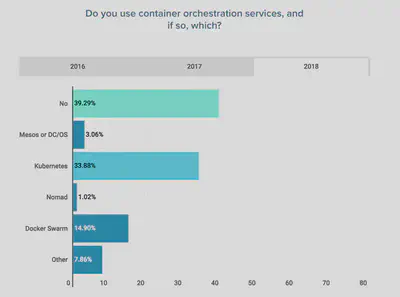 - Logz.io 的 DevOps Pulse 调查发现,在 2018 年,60.71%的接受调查的人员采用了容器编排,高于 2017 年的 42.11%。