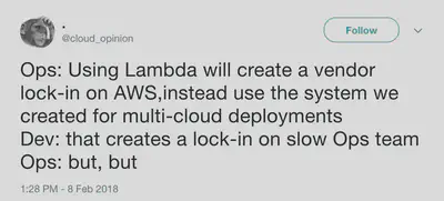 Serverless 的批评者通常使用供应商锁定作为他们的论据。与此同时,大多数 AWS 客户实际上都在要求更紧密的集成,以便他们可以从平台中获取更多价值。