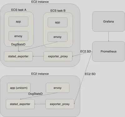 如果您在不使用 ECS 或 Docker 的情况下直接在 EC2 实例上运行应用程序进程,则 Envoy 进程作为守护进程直接在实例中运行,但架构几乎相同。有一个原因是没有将 Prometheus 直接设置为 Envoy,因为我们仍然无法从 Envoy 的 Prometheus 兼容端点中提取直方图度量。由于这将在未来得到改善,我们计划在当时消除 stasd_exporter。