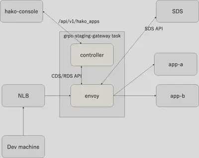 另外,作为服务网格的一个子系统,你必须部署网关从开发商手中获得 staging 环境的 gRPC 服务器应用程序(假设使用客户端负载均衡进行访问,我们需要一个组件来解决它)。它是通过将 SDS API 和 Envoy 与管理称为 hako-console 的内部应用程序的软件相结合而构建的。