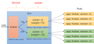 我们来对比 Istio 中实现类似功能的方式,Istio 中需要为准备进行流量拆分的服务定义 VirtualService,通过 subset 来区分不同的流量去向: