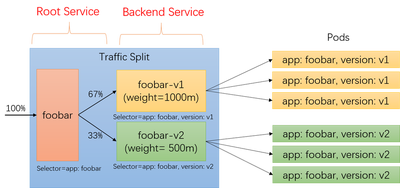 spec.service指定,这是 Traffic Split 的 root service,是要配置进行流量拆分的目标服务的 FQDN,客户端用这个 service 进行通信,也就是说这个 root service 是暴露给客户端的。 - “footer-v1” 和 “footer-v2”:这两个后端服务,是"隐藏"在 root service 后面的,通常是 root service 的子集,典型实现上是 selector 多加一个 version label 限制。