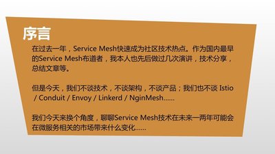 刚才主持人张亮提到说,过去一年 Service Mesh 成为一个热词。基本上,在国内的话,我差不多是 Service Mesh 最早的布道师。可能如果大家之前有看相关的资料的话,应该会看到一些我的资料。我先后做过几场的演讲,做过一些技术的分享,也写过很多文章。但在此之前,这些内容可能更多的都是集中在技术领域。那今天我们会特殊一点,我们今天不谈详细的技术,不谈具体的架构,我们也不谈具体的产品。后面的这些名词,Istio/Conduit/Envoy/Linkerd/Nginmesh,这些词可能听过,可能没听过,但没问题,今天这些我们统统都不讲。我们今天要讲另外一个东西:我们会聊一聊在未来一两年之内,Service Mesh 技术会在微服务相关的市场带来什么样的变化?