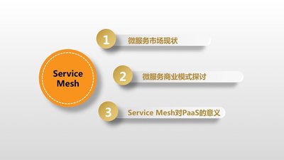 主要内容会是三大块:首先我们会看一下目前微服务的市场的一些现状,然后接下来我们会探讨一下它的商业模式,在第三块,我们会重点讲一下 Service Mesh 对 PaaS 的意义。