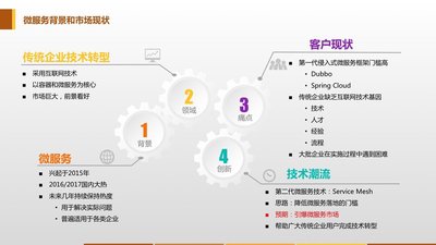 目前微服务的背景是这样,首先目前在市场上是有这么一个潮流:传统企业会慢慢向互联网技术转型,其中微服务和容器是这个技术转型的核心。这个市场比较大,大家也都看好这样一个方向,这是大的时代背景。
