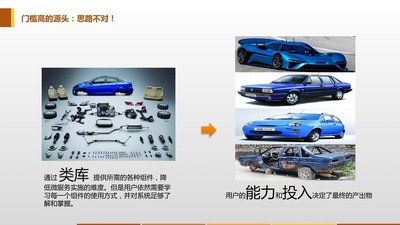 我们先看左边这个图,我们现在如果是想要一辆汽车,那 OK,可以像左边这个图一样。我们看到一辆汽车分解之后是会有多少个零件?我们现在通过类库的方式,实际去组装辆汽车,我可以给你不同的组件,不同的类库,然后告诉你这个是发动机,这个是轮胎,这个是刹车……这确实会比自己从头到尾,从每一个螺丝钉开始制造,去组装整车要轻松的多,比如说至少有个成熟的发动机,至少方向盘可以不用自己做了。但是实际上,对用户而言,必须要对整体有非常深的认识:你知道每个组件能做什么,选择合适的组件,并把他们并拢起来。这样对一个系统的了解是需要比较深的。