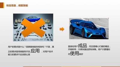 我们再看看右边:你组装出来的东西是什么样子?最上面这个跑车可能是所有人的梦想,对吧?但实际当中,不同的用户,他的能力是不一样的,他的投入也不一样。那他最终得到产出品,很有可能不是上面的这个让大家心动的跑车。很可能只是一个普通的大众,只能只一个 QQ,甚至,其实最后一张图非常凄惨:不知道出来的会是什么,很可能是接近无法使用的产品。