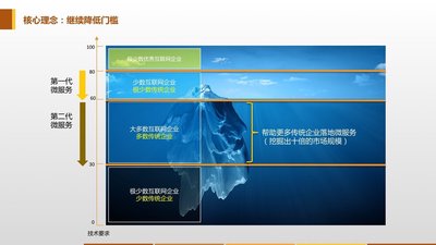 第一代微服务至少提供了一些成熟的组件,比如说发动机 OK 啦,这个门槛它降低了一部分。第二代微服务,我们是希望在这个基础上,将门槛进一步降低。60 分不再是及格线,我们希望将它降成 30 分。这个目标如果能够达成,对于期望用微服务来做技术革新的企业来说,他这个时候可以更容易地落地。大家可以想象,一场考试,及格线是 60 分和及格线是 30 分,这个时候及格率会发生质的变化,这个时候能释放出来的市场规模也会远远大于前者。